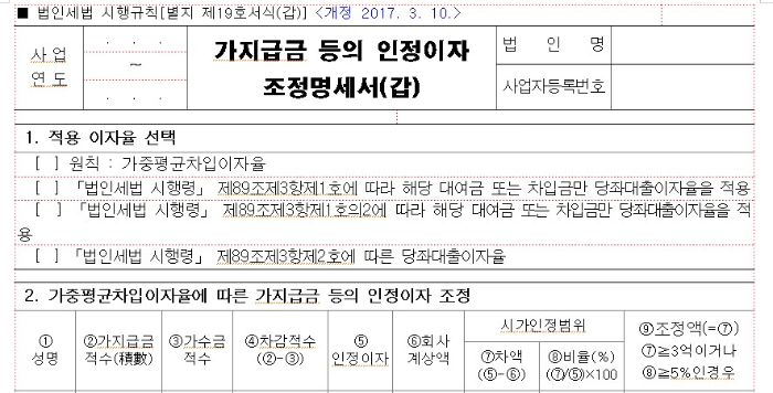 법인의 특수관계자인 주주나 임원 등에게 명칭 여하에 불구하고 자금의 대여액에 대하여는 시가보다 무상, 저리로 대여한 경우 가지급금의 적수에 일자를 곱하고 인정이자율을 곱하여 인정이자를 계상합니다. 가지급금 인정이자 익금산입액은 계산한 금액이 3억 원 이상 또는 5% 이상인 경우 익금산입 상여등으로 소득처분 합니다.