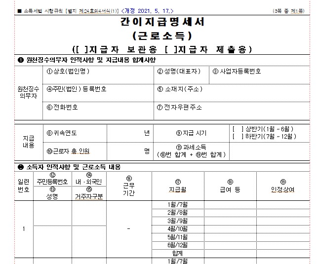 아래 서식에 작성하셔서 세무서 제출 바랍니다.