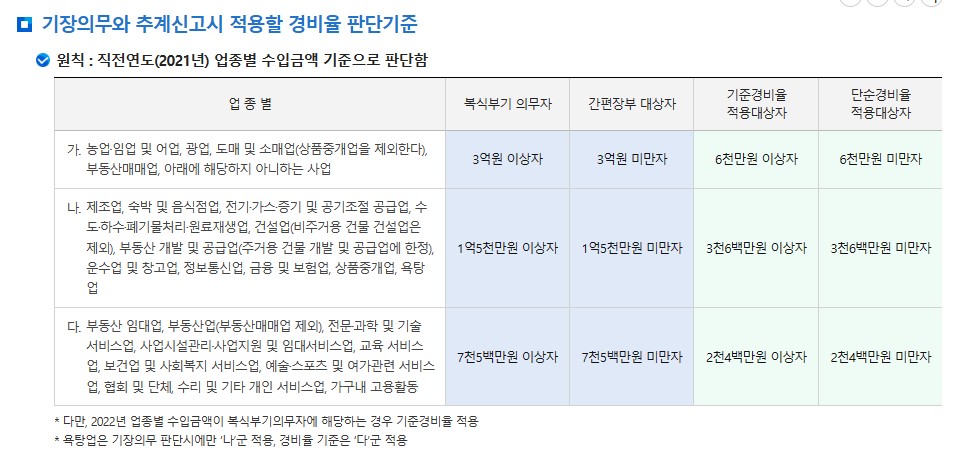 업종별 단순경비율을 적용받을 수 있는 수입 기준이 다릅니다. 단순경비율 적용 대상자는 높은 경비율로 소득세 신고 부담이 없지만 기준경비율 대상자는 장부기장 신고를 해야 소득세 부담을 줄일 수 있습니다. 간편 장부신고를 하거나 복식장부로 신고해야 합니다. 간편 장부를 만들 수 있는 능력자라면 복식부기 장부 만들기 어렵지 않습니다. 간편 장부대상자가 복식장부로 신고 시 기장세액공제 20% 적용이 가능합니다