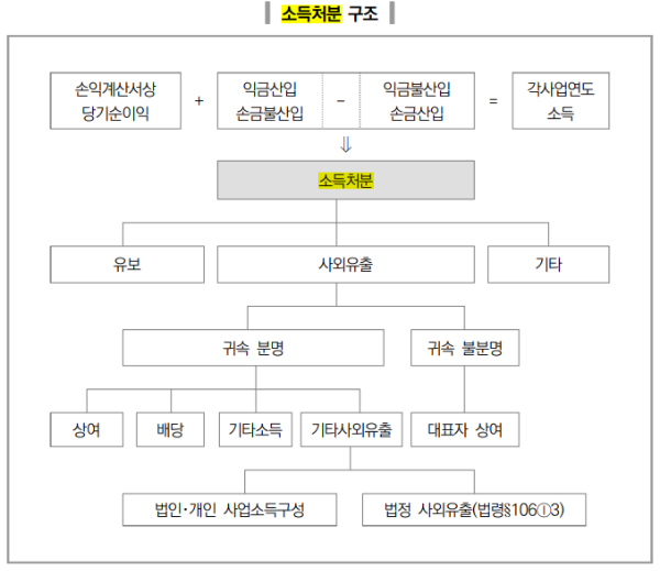 법인세 산출세액의 계산은 손익계산서상의 당기순이익에 익금산입 손금불산입금액을 더하고 익금불산입 손금산입금액을 차감하여 각 사업연도의 소득금액에 법인세율 반영하고 기타 공제 감면세액을 차감하고 기납부세액을 차감하여 납부세액을 계산합니다. 소득처분은 다시 유보, 사외유출, 기타로 처분되며 사외유출 시에는 귀속에 따라 상여, 배당, 기타 소득, 기타 사외유출등으로 처분합니다.