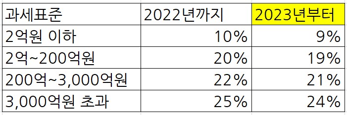 2023년 1월 1일 개시하는 사업연도 분부터 인하된 법인세 세율로 적용합니다.