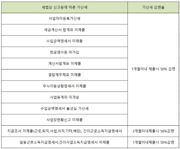 세법에 따른 제출 신고 가입 등록 개설의 기한이 경과한 후 1개월 이내에 세법에 따른 제출 의무를 이행하는 경우 가산세를 50% 감면합니다.