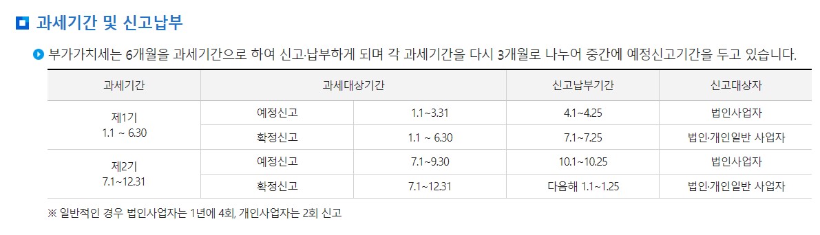 다만 직전 과세 기간의 공급가액(1~6월) 합계액이 1억 5천만 원 미만인 소규모 법인과 일반과세자 개인사업자는 직전과세기간 6개월(1~6월분) 납부액의 1/2 금액만큼 예정고지 세액으로 납부가 가능합니다. 부가가치세 신고 의무는 없습니다.