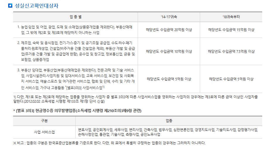 2011년도 과세 기간의 종합소득세 신고부터 성실신고 확인제도가 도입되었으며 수입금액이 업종별로 일정규모 이상일 경우 종합소득세 신고를 할 때 장부기장내용의 정확성 여부를 세무사 등에게 확인받아 성실한 신고를 유도하기 위한 제도로 종합소득세 성실신고 대상자는 익년 6월 말까지 신고 납부합니다.