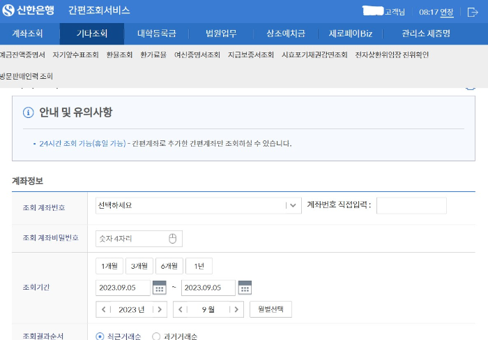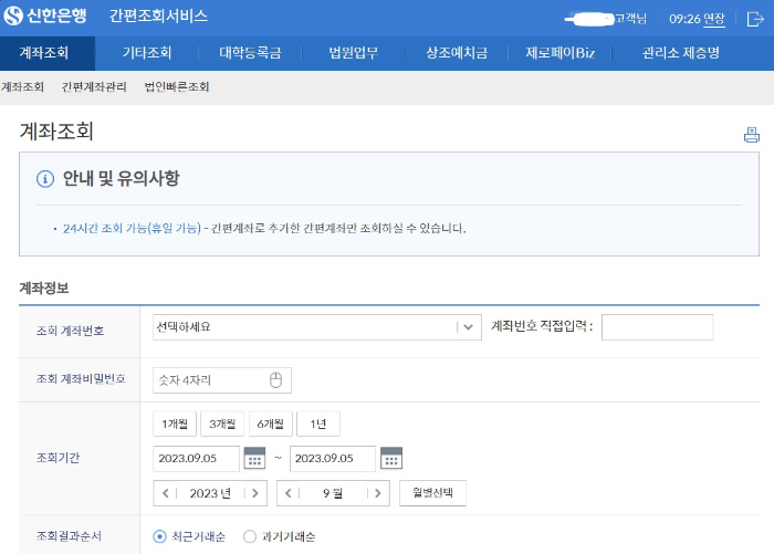 회원가입 후 간편 서비스 아이디, 비번으로 로그인-간편 조회-계좌조회 탭에서 거래내역조회가 가능합니다.