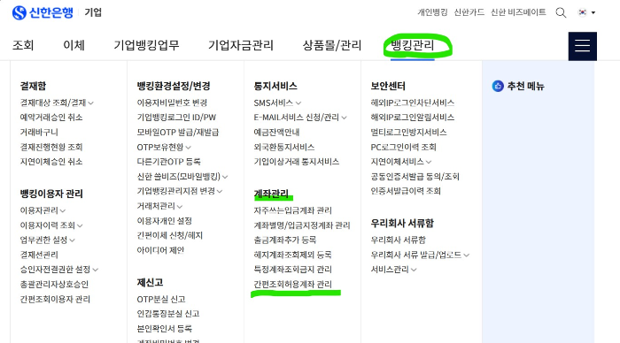 2. 인터넷뱅킹 공인인증서로 로그인하여-빙킹관리-간편 조회허용계좌관리탭에서 허용계좌를 승인합니다.-회사에서 진행