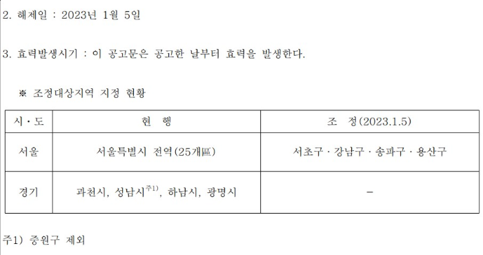 조정대상지역 2023.01.05 공시 현재 서초구, 강남구, 송파구 용산구입니다.