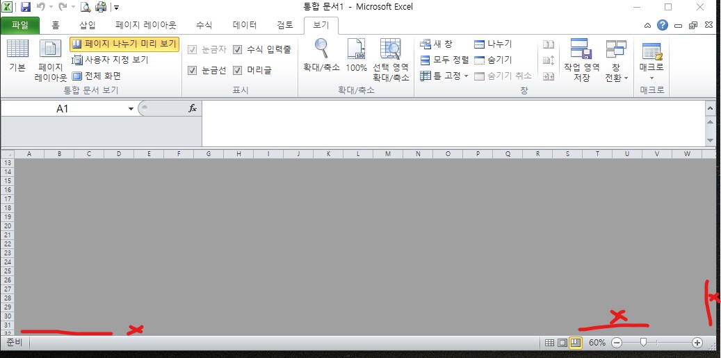 시트 탭과 가로 세로 스크롤 막대가 없어요.