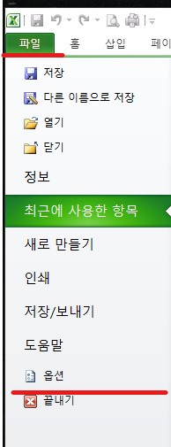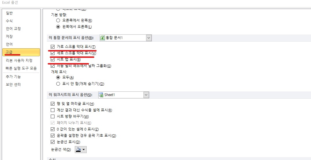 파일-옵션-고급-스크롤을 아래로 내리다 보면-시트 탭 표시-체크하고 확인클릭