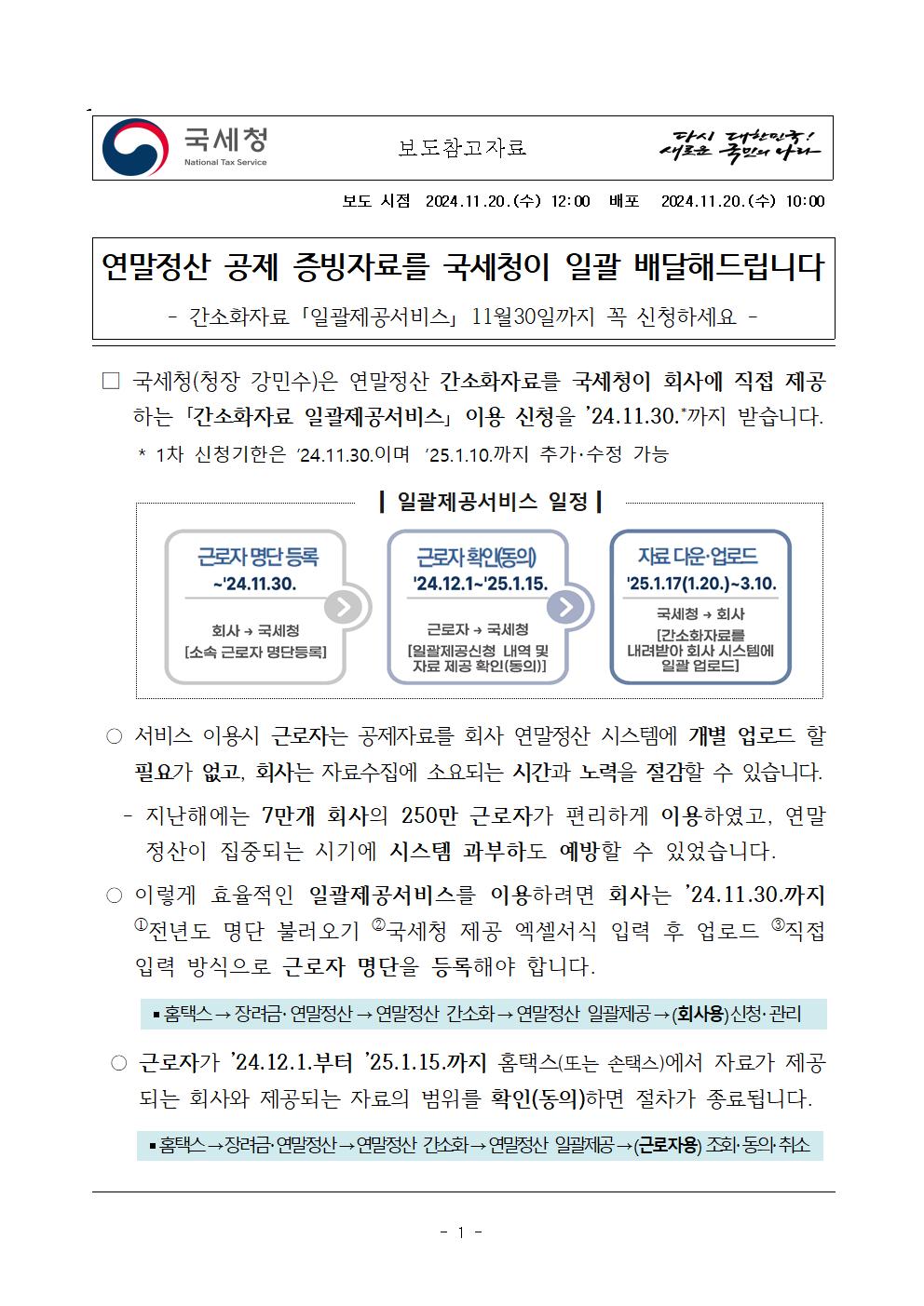 회사는 11월 30일까지 일괄제공신청과 직원명단을 업로드합니다.