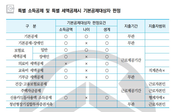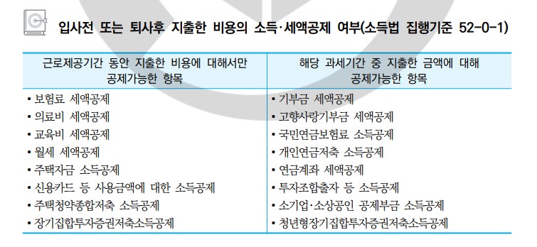 연말정산 시 입사 전 또는 퇴사 후 지출한 비용의 소득, 세액공제가 가능한 항목과 근로제공기간 동안 지출 비용에 대해서만 공제 가 가능한 항목입니다.