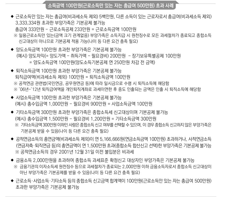 소득금액 1백만 원 이하가 아니므로 부양가족 공제가 불가합니다.