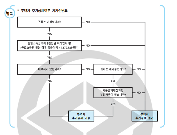 - 부녀자공제-종합소득금액이 3천만원(근로소득만 있는 경우 총 급여액 41,470,588원) 이하 이고, 배우자가 있는 여성 또는 배우자가 없는 여성 거주자가 기본 공제 대항 부양가족이 있는 세대주, 50만 원 공제