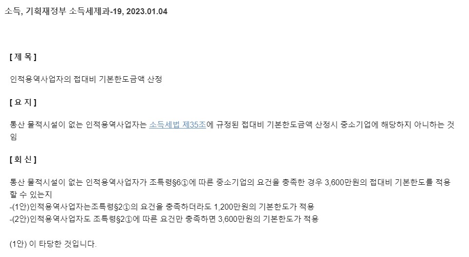 사업장이 없는 프리랜서 인적용역자는 접대비 기본 한도가 1,200만 원입니다.