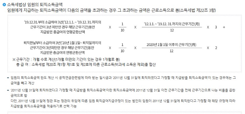 임원에 대한 퇴직금 세법 규정이 2012년 신설되었으며 소득세법상 임원퇴직소득 한도는 2배수(2012년~2019년까지는 3배수)에 해당되는 퇴직금까지는 퇴직소득세가 부과되고 그초과하는 금액은 근로소득세가 부과됩니다.