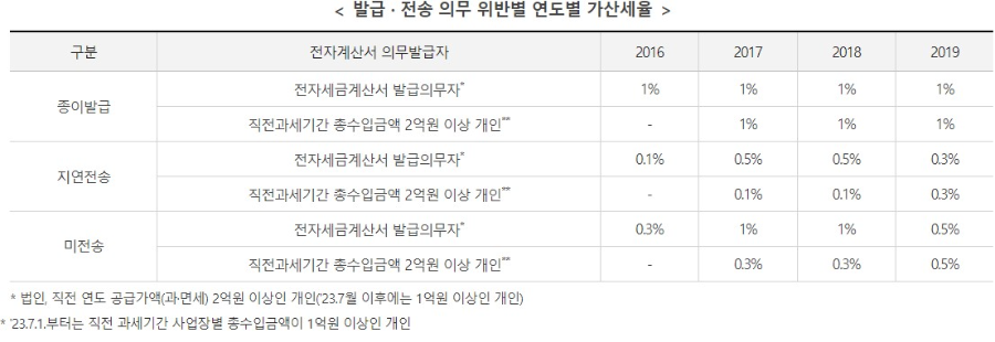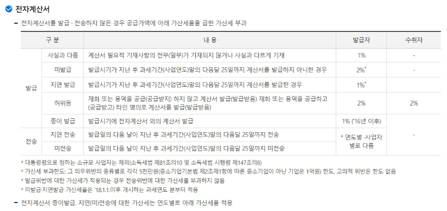 발급시기가 지난 후 공급시기가 속하는 과세기간에 대한 확정신고기한 내에 발급하지 않은 경우 2% 가산세가 적용되며, 발급시기가 지난 후 공급시기가 속하는 과세기간에 대한 확정신고기한 내에 발급한 경우 1% 가산세가 적용됩니다. 매입자는 발급시기가 지난 후 확정신고기한 내 수령 시에는 0.5% 가산세를 적용하고 매입세액공제는 가능하며, 확정신고기한 이후 수령 시에는 매입세액 공제가 불가합니다.