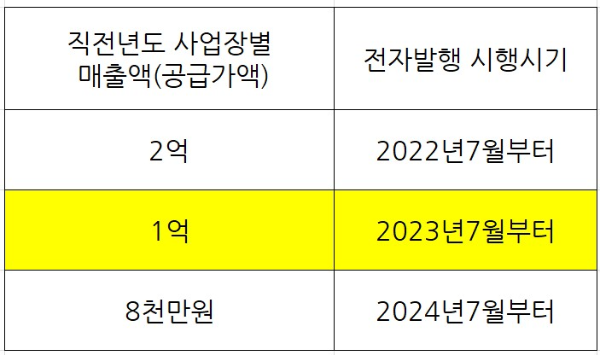 또한 2024년 7월 1일부터는 직전연도 사업장별 공급가액이 8천만 원 이상인 개인사업자로 확대됩니다.
