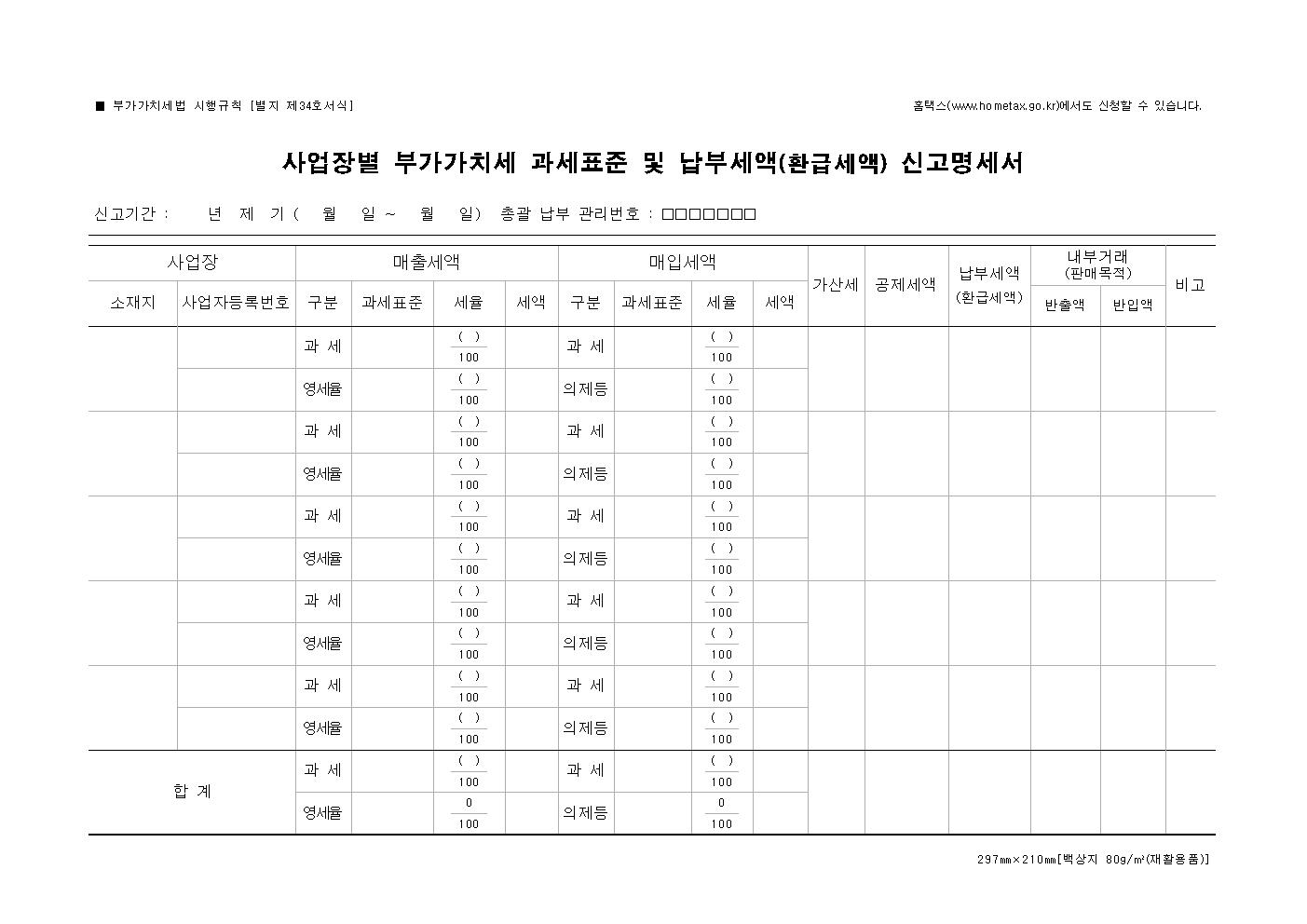 주 사업장에서 사업장별 부가가치세 과세표준 및 납부세액 신고명세서에