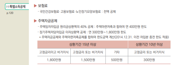 연말정산 시 특별소득공제 항목 중 주택임차 차입금 원리금 상환액 소득 공제는 무주택 세대주가 전세 자금 대출을 은행에서 계약서 상 입주일과 주민등록 전입일 중 빠른 날로부터 3개월 이내에 차입시 차입금원리금 상환액과 이자 납부 금액에 대해 40% 공제하며 한도는 주택 마련 저축공제와 합하여 연 400만 원 한도로 소득공제 합니다. 개인에게 차입시는 연급여액이 5천만 원 미만자에게만 해당됩니다.