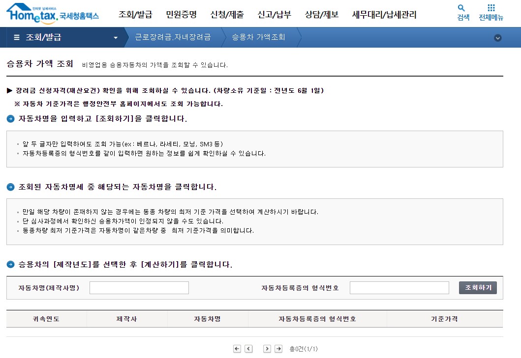 국세청 홈텍스에서 승용차 가액 조회 탭에서 차량명과 연식을 입력하여 조회 가능합니다.