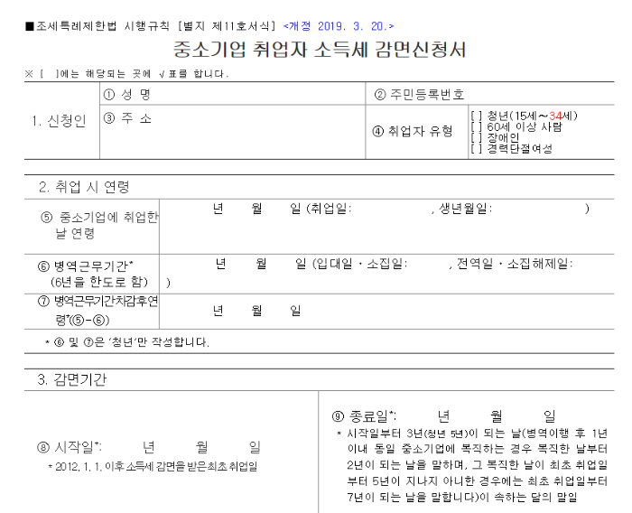 중소기업에 취업한 경우 근로자는 취업일로부터 3년(청년의 경우는 5년) 동안 발생한 소득세의 70%(청년은 90%)를 2023년부터는 연 200백만 원(2022년까지는 150만 원) 한도 내에서 소득세를 감면합니다. 우선 근무 회사가 중소기업요건에 맞는지 확인하시고 청년, 60세 이상, 장애인, 경력단절여성 조건 해당되신 다면 회사에 중소기업 취업자 소득세 감면신청서를 제출하시고 회사에서는 세무서에 감면대상 명세서를 제출하면 됩니다. 회사에서는 세무서에 서면 제출하거나 홈텍스에서 전자 신고 하시면 됩니다. (감면신청은 최초 입사 시에 꼭 신청해야 하는 것은 아닙니다. 이직 시에도 신청 가능합니다. 다만 신고를 하였고 기간 만료 전에 다른 중소기업으로 이직한 경우 기간을 이어서 감면 가능하므로 이직 회사에서 다시 신청을 하면 됩니다.)
