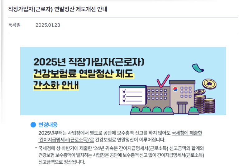 카테고리 없음 직장가입자 건강보험료 보수총액 신고 제도 개선 by taxguide23 2025. 2. 3. 반응형 2024년도 귀속 부터 건강보험 보수총액 신고를 안해도 되네요. 오류가 있을경우 신고 해야힙니다. 간이지급명세서를 기준으로 공단에서 보수총액신고을 정산합니다. 반응형 공유하기 게시글 관리 비즈니스 가이드 저작자표시 (새창열림) 댓글