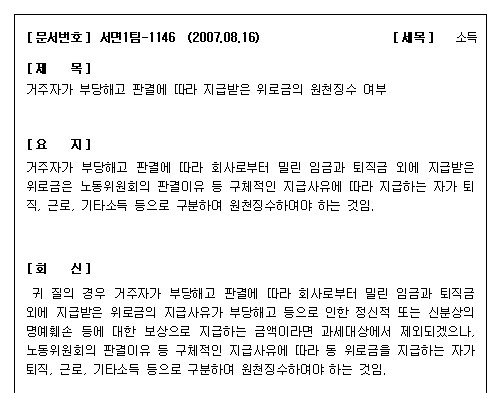 [노동] 해고무효확인소송 화해권고결정 화해금의 근로소득/기타소득 과세 여부 문제상황 계약 갱신 거절을 ...