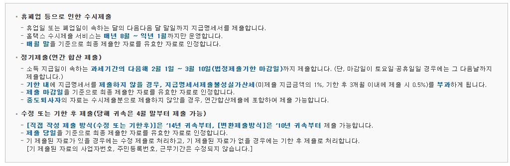 3. 근로, 사업, 기타, 이자, 퇴직소득 지급이 있는 경우 폐업월의 다음다음 달 말일까지 지급명세서 제출