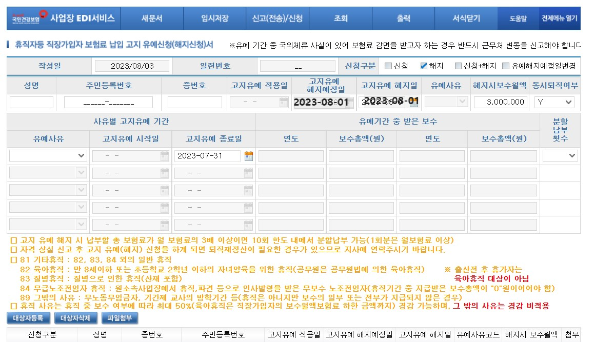 상실신고 시 근무월수는 휴직월을 제외하고 입력합니다.