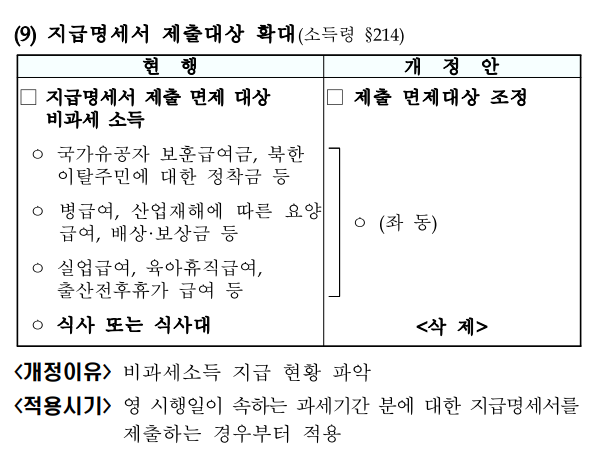 식대는 비과세로 지급명세서 제출시 제출대상이 아니었는데요. 2023년 2월 지급분부터 원천징수 이행 상황신고 시 제출대상 소득으로 신고해야 합니다. 적용시기는 2023년 2월 28일 이후 신고분부터로 2월 지급분을 3월 신고분부터 적용입니다. 지급명세서 제출 시 반영하는 비과세 소득은 야간근로수당, 출산보육수당, 연구보조비, 식대 등입니다.