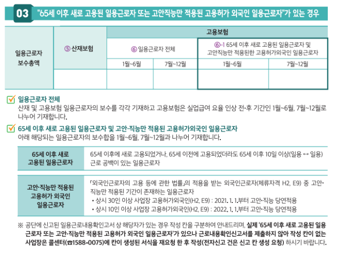 휴직자는 보수월액 산정 시 산재보험은 휴직기간 급여 제외 하며, 고용보험은 휴직기간의 급여를 포함하여 반영하며, 고용보험료는 2022년 7월부터 인상 반영되었기 때문에 상반기 하반기로 보수월액을 구분하여 신고합니다.(2022년도 만 적용) 대표자는 신고 대상이 아닙니다. 배우자는 근로자로 인정받은 경우 대상자입니다.(실제근로확인등 고용센터에 실제 근무를 인정받아야 합니다.) 연도 중 근로자가 퇴사하여 현재 근로자가 없더라도 신고대상입니다.(대상 근로자 없음 체크 후 신고) 전근근로자는 전근전 사업장과 전근후 사업장에 각 각 신고합니다. 일용근로자는 근로내용신고를 한 대상자의 자료를 입력합니다. 60시간 미만 일용근로자로 근로내용신고를 하지 않은 근로자는 60시간 미만 근로자 산재보험 탭에 입력합니다. 건설업 사업장은 개산 보험료 확정 보험료를 신고합니다. 3월 31까지 자진 신고하고 납부합니다.